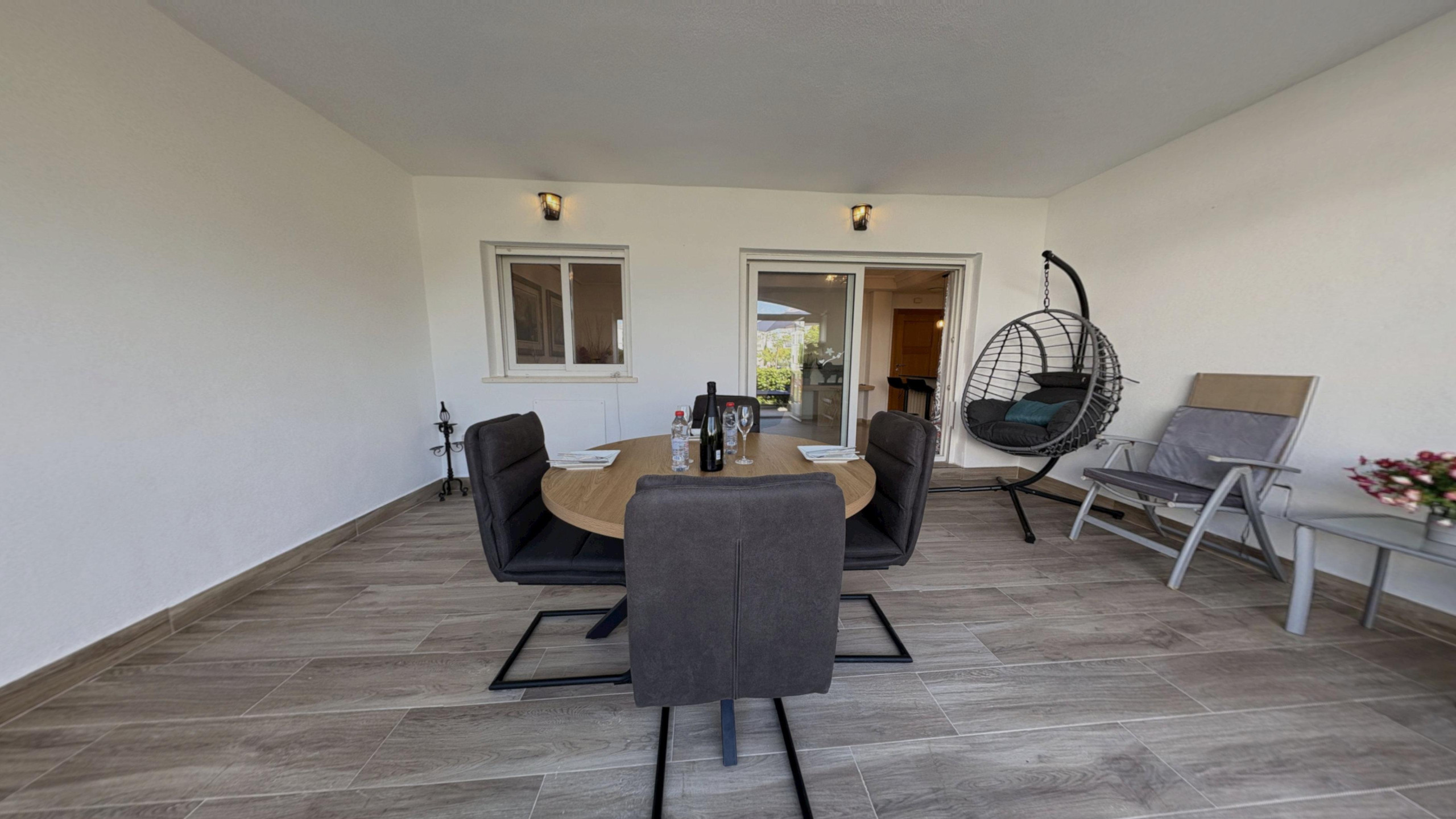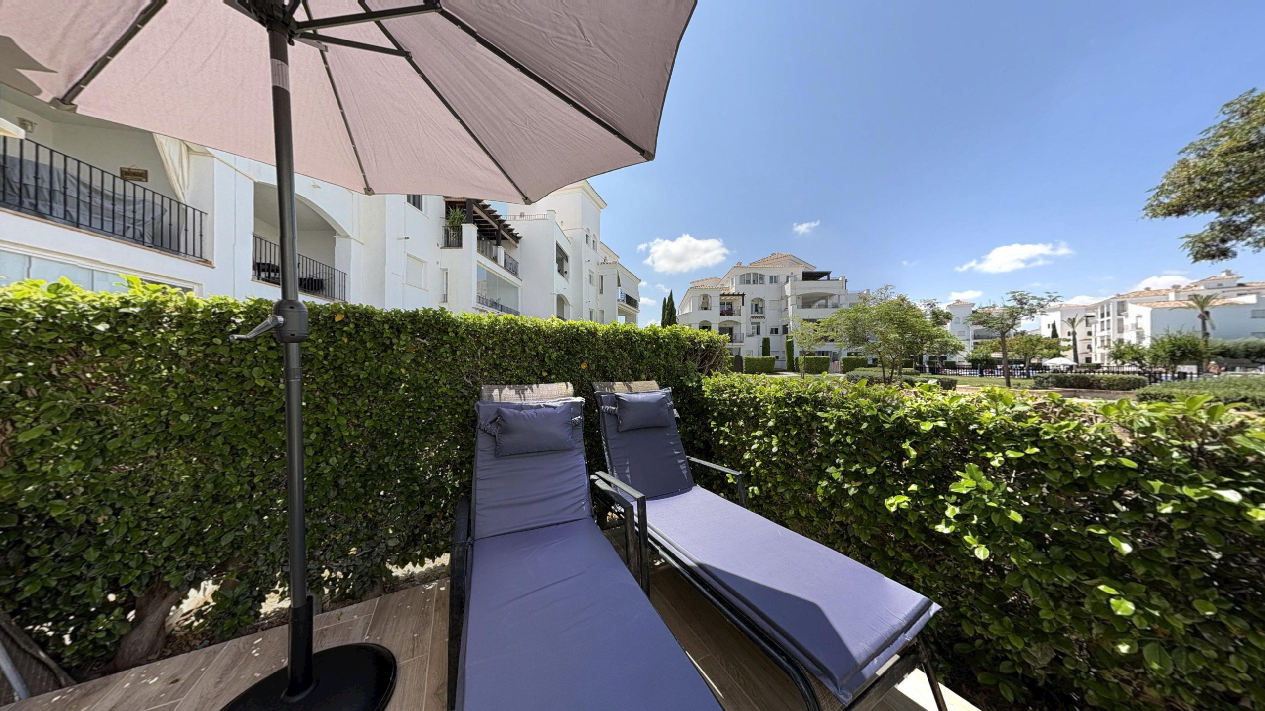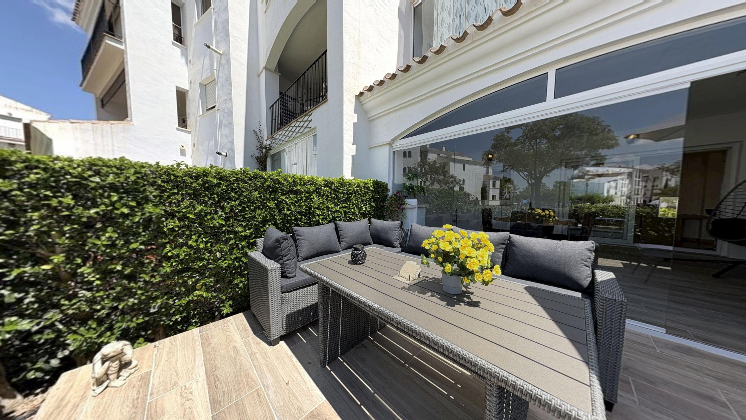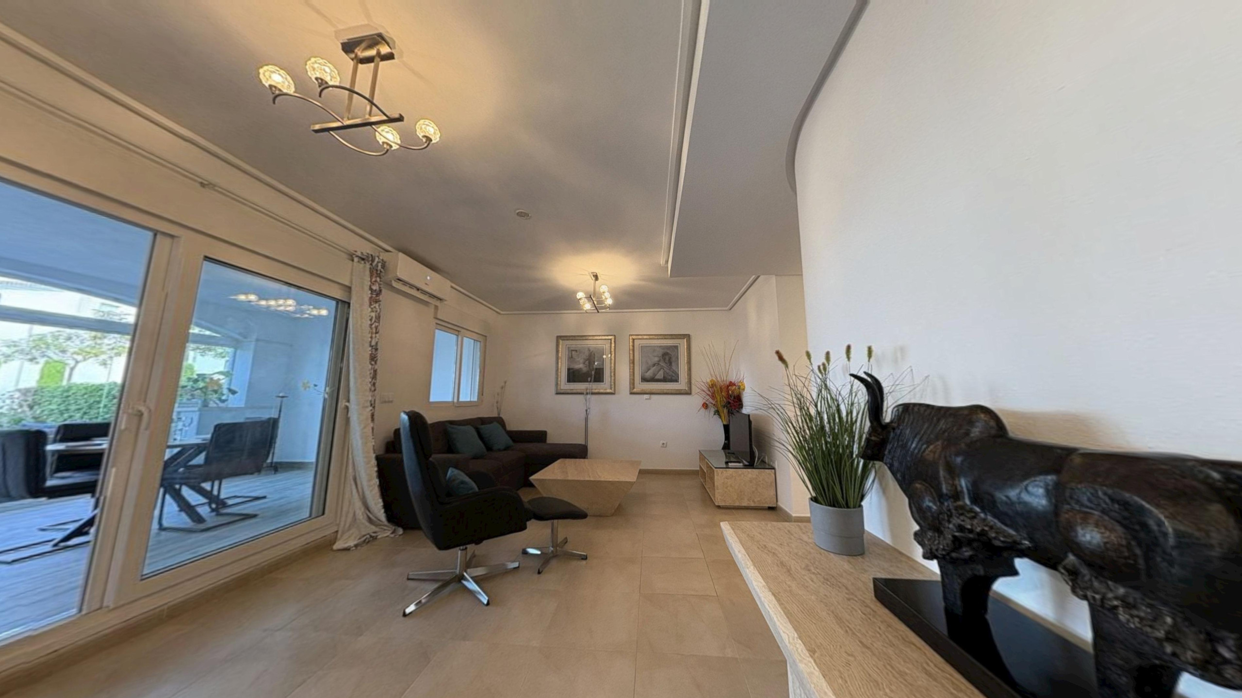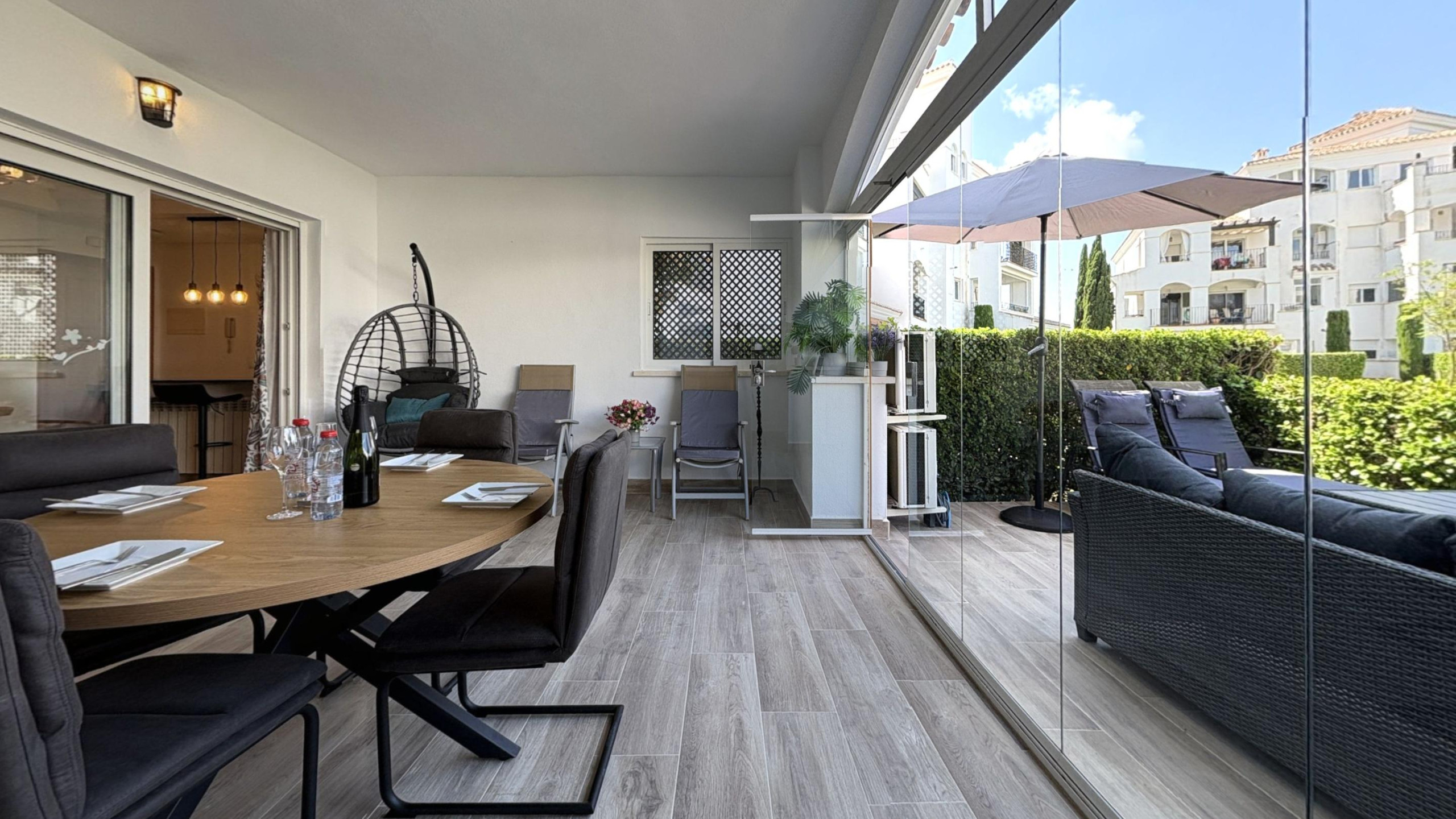 Impresionante apartamento de 2 dormitorios en planta baja con vistas al golf y cortinas de cristal para crear espacio adicional.
