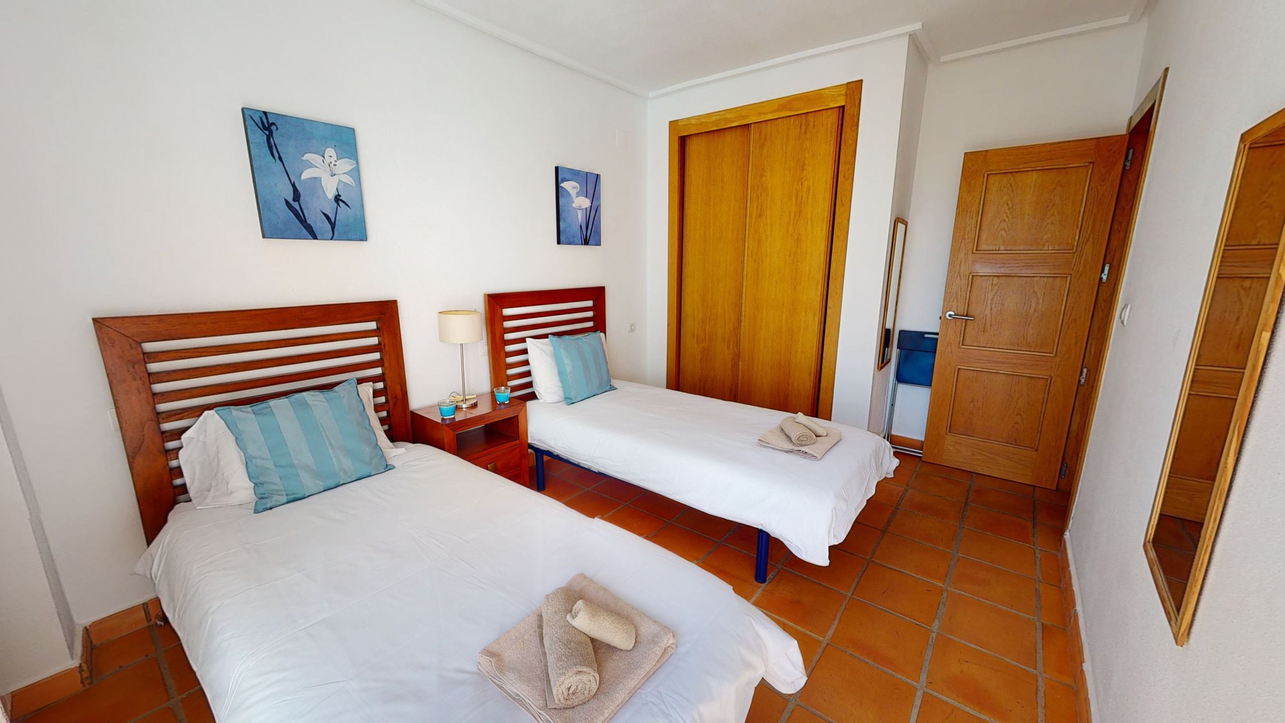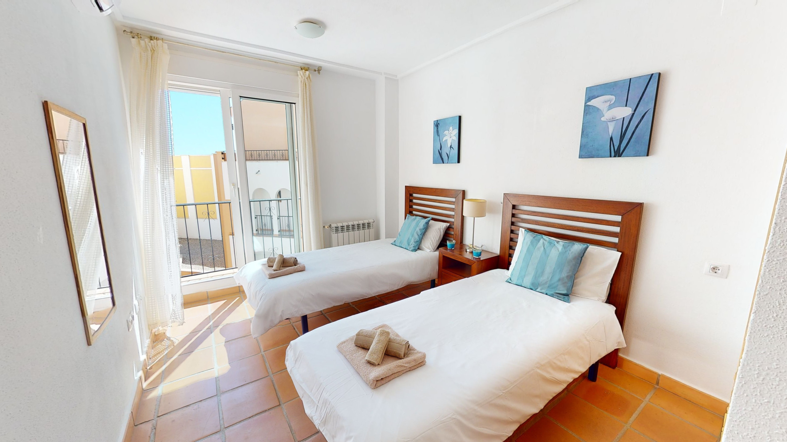 El dormitorio principal con cama doble tiene baño privado, y la propiedad también cuenta con un baño familiar. El segundo dormitorio tiene dos camas individuales.