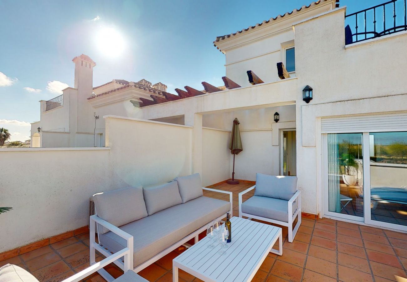 Casa adosada de decoración moderna con vistas en primera línea de golf en el hoyo 6. La terraza superior tiene mesa y sillas, la terraza intermedia tiene sofás y tumbonas modernos y la terraza inferior tiene juego de comedor y sofás. Cerca del centro de la ciudad y de las tiendas en una tranquila calle sin salida.