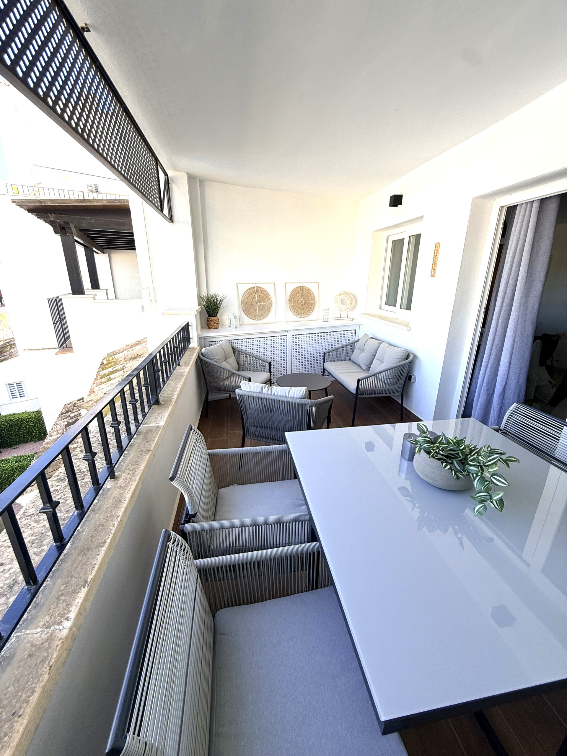 El amplio salón del apartamento da a la gran terraza acristalada en forma de L. La terraza está orientada al sureste, tiene vistas de primera línea de golf y una vista directa a la piscina cercana.