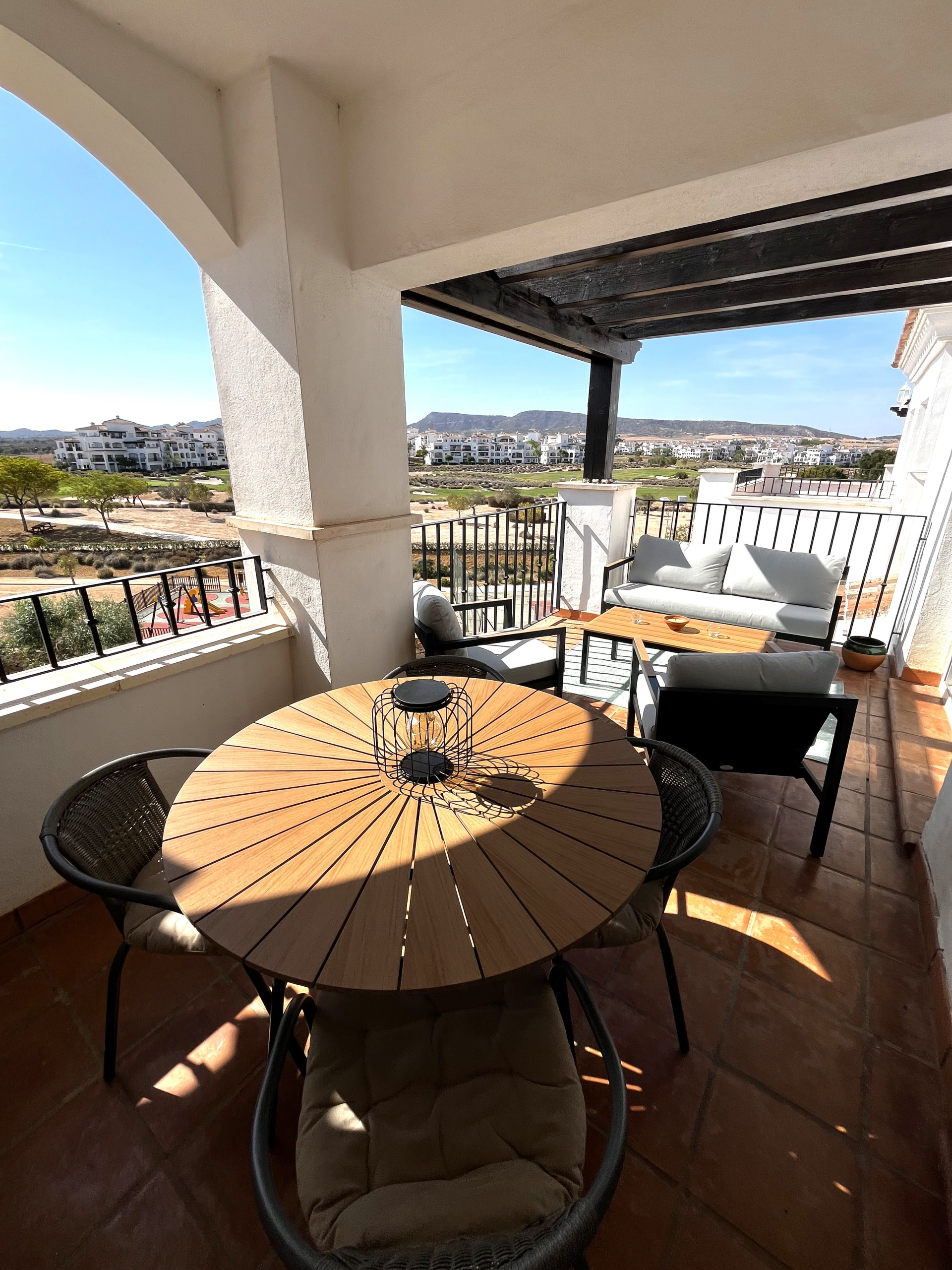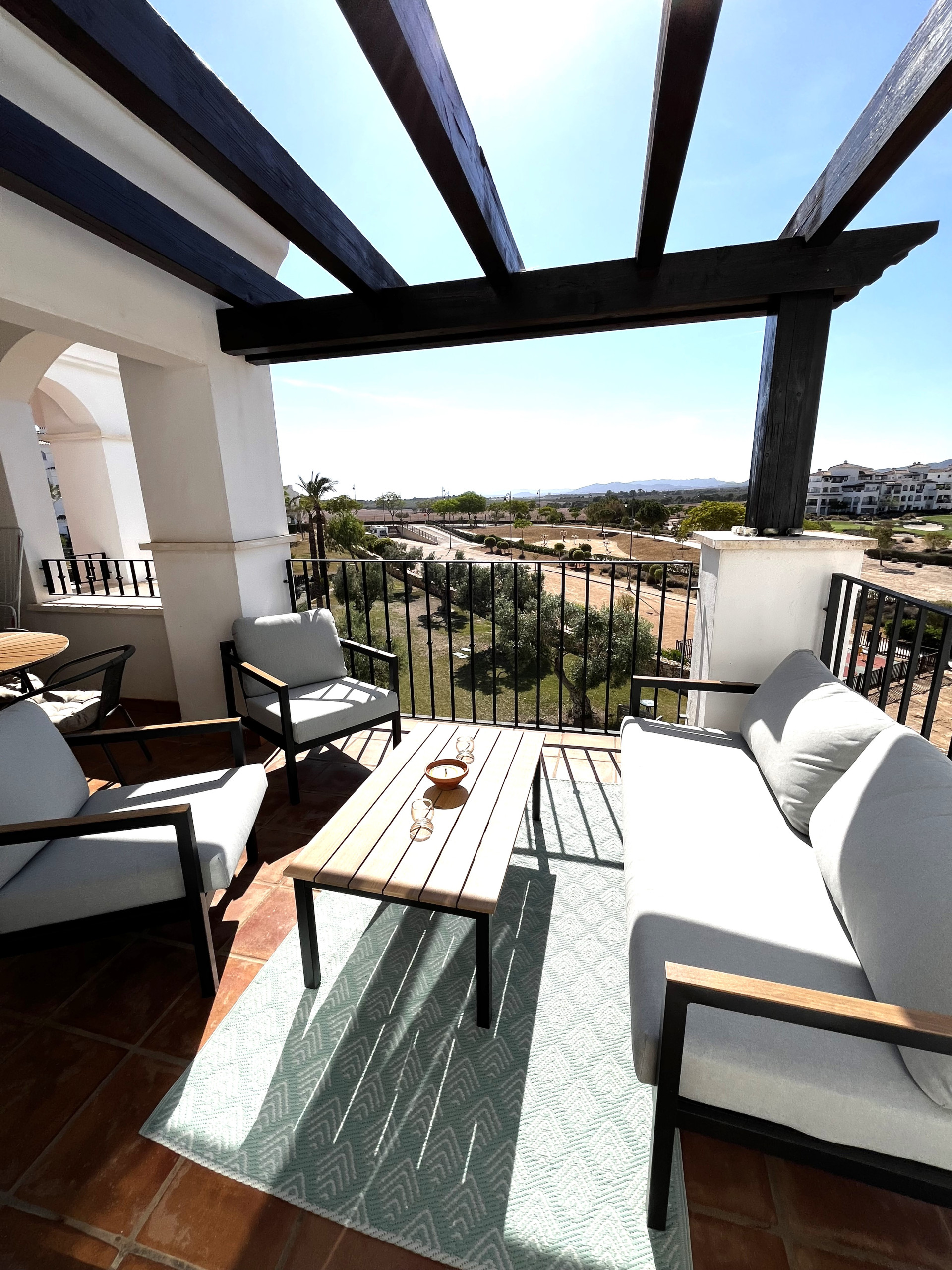 Este Penthouse está bellamente decorado y tiene vista al tercer hoyo del campo de golf Jack Nicolaus en Hacienda Riquelme. Tiene dos dormitorios que se abren a pequeñas terrazas delanteras, y hay una amplia terraza abierta que da al campo de golf. Está a un corto paseo del campo de prácticas, la tienda de golf, el supermercado, el restaurante y el bar. Los huéspedes tienen acceso a todas las piscinas compartidas del complejo, junto con áreas de juego y canchas de tenis con seguridad las 24 horas en el sitio.