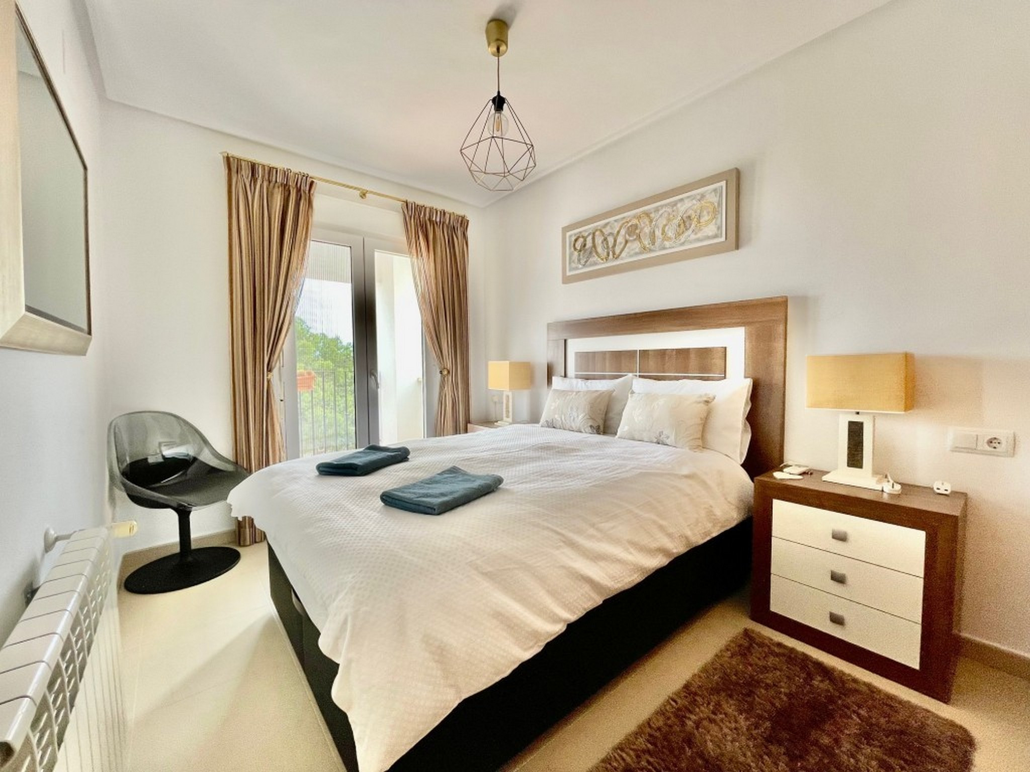 El alojamiento viene completamente equipado: zona de jardín, muebles de jardín, terraza, lavadora, plancha, internet (Wi-Fi), calefacción central, aire acondicionado en toda la casa, acceso a piscina comunitaria, aparcamiento exterior, TV/TV por satélite (Idiomas: español, inglés, alemán), sistema de música y un juego de palos de golf.