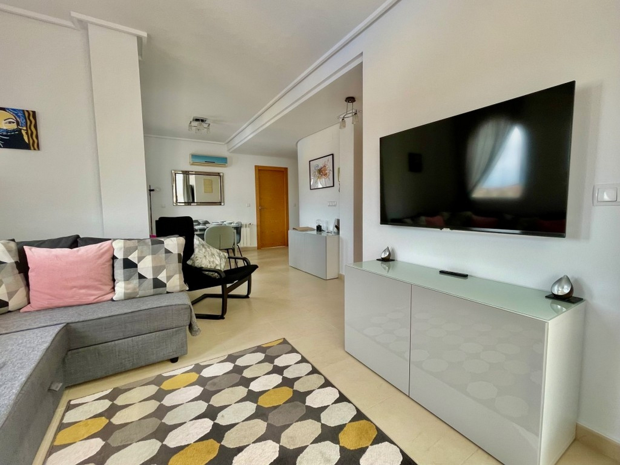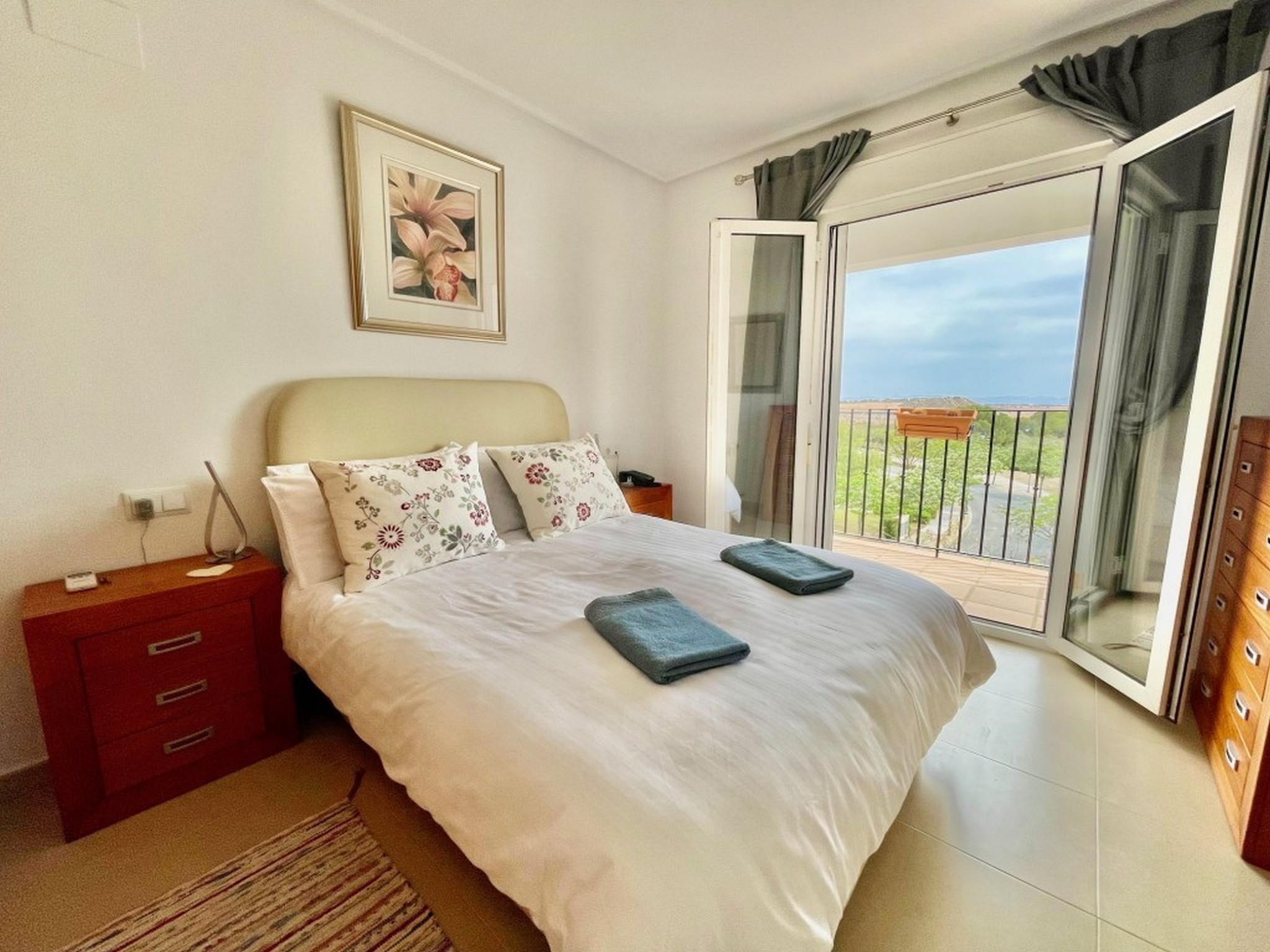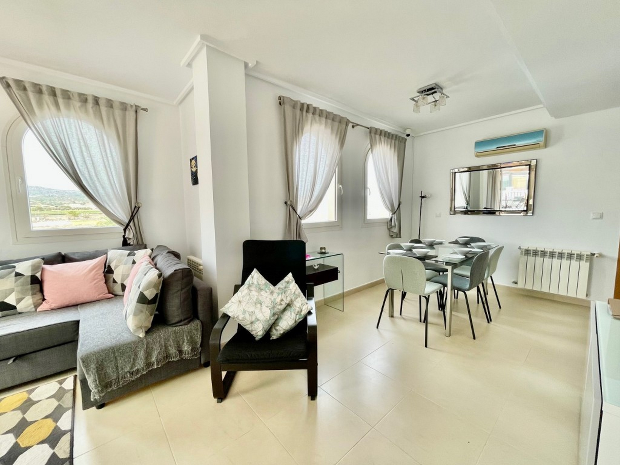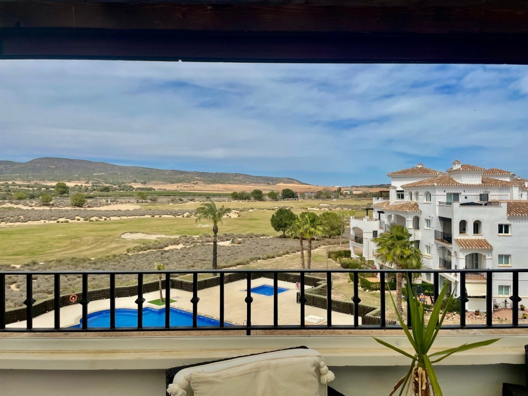 Atico de 2 dormitorios en un complejo de golf con fantásticas vistas a la piscina, al campo de golf y a la montaña. Este moderno ático totalmente equipado tiene capacidad para 6 personas. El salón, con sofá cama doble, cuenta con aire acondicionado y es ideal para recibir invitados. Desde allí se accede a una terraza trasera parcialmente cerrada, con cortinas de cristal y suelo de baldosas, equipada con muebles de exterior. Su fantástica orientación permite disfrutar del sol tanto en verano como en invierno y ofrece vistas a una de las 19 piscinas comunitarias del complejo y al campo de golf. El apartamento dispone de internet de fibra óptica gratuito y canales de televisión por cable internacionales. Dos dormitorios dobles, ambos con aire acondicionado, armarios empotrados y puertas que dan a la terraza delantera. El baño principal está totalmente modernizado con ducha a ras de suelo, lavabo con espejo, inodoro y toallero eléctrico. A pocos pasos se encuentran la casa club/bar-restaurante, el supermercado, las pistas de tenis, el campo de prácticas y el putting green, y a tan solo 5 minutos en coche se encuentra la localidad de Sucina, con una amplia oferta de servicios y bares/restaurantes. A 10 minutos en coche de las preciosas playas del Mar Menor y a 20 minutos del Aeropuerto Internacional de Murcia. Su ubicación es ideal para disfrutar de todo lo que ofrece la Costa Cálida.