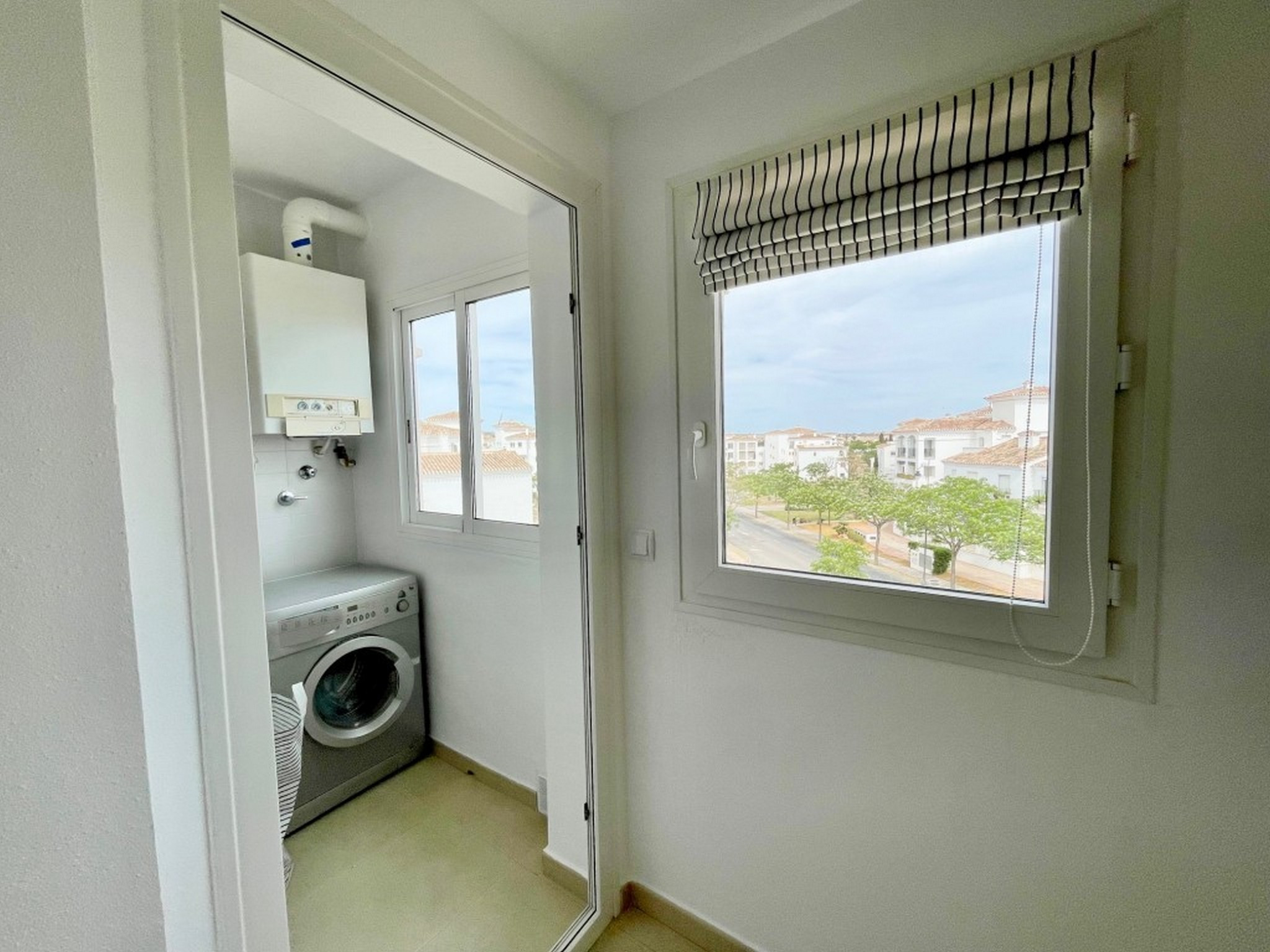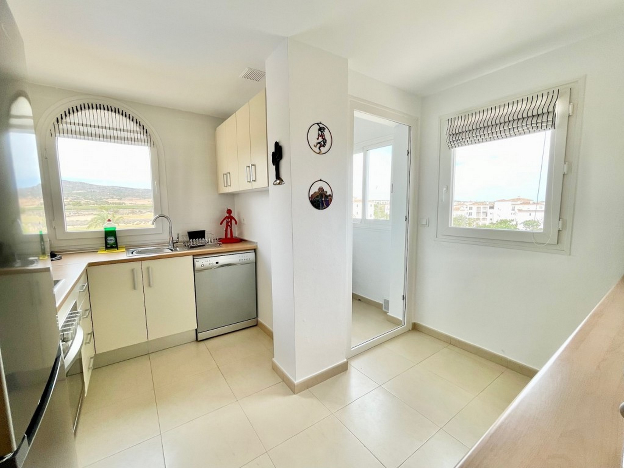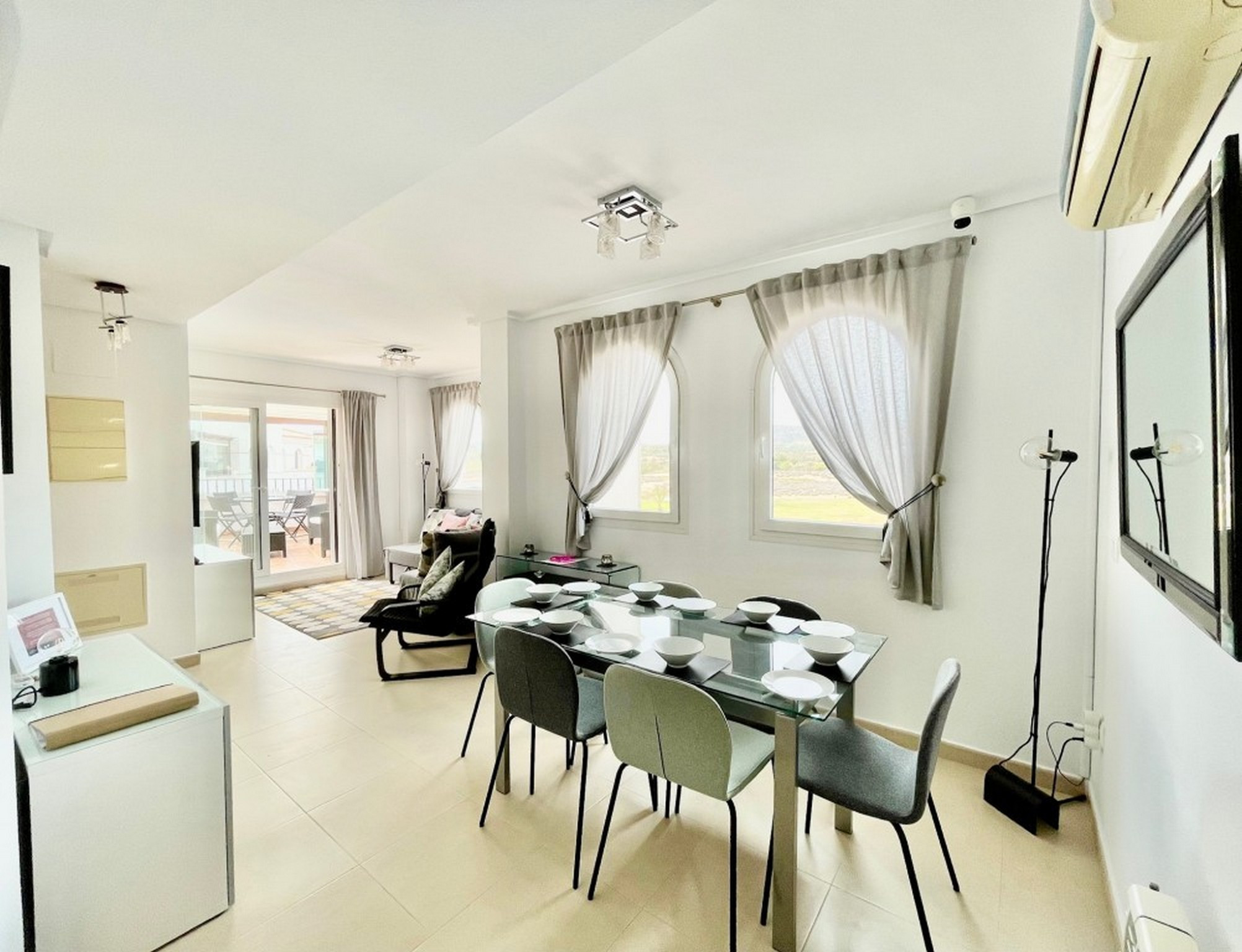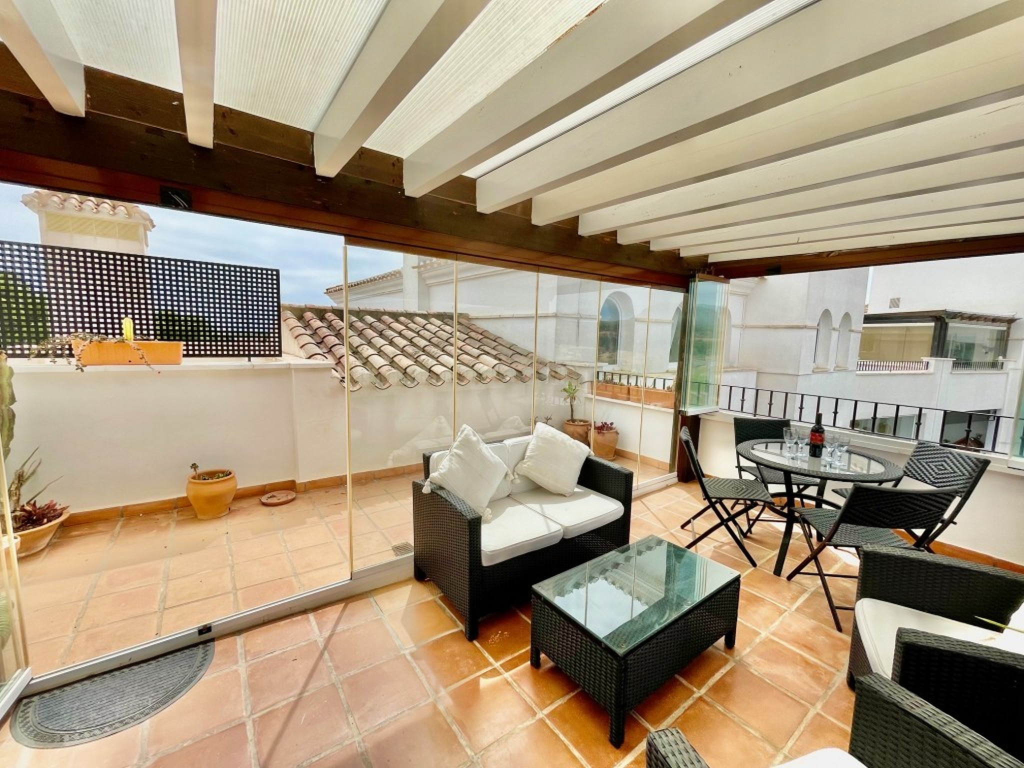 Apartamento moderno de dos dormitorios con cortinas de vidrio y terraza completamente alicatada. Da a la tercera calle del campo de golf y es un paseo fácil hasta la piscina tranquila, ya que está a solo una manzana de distancia. Orientación sur.