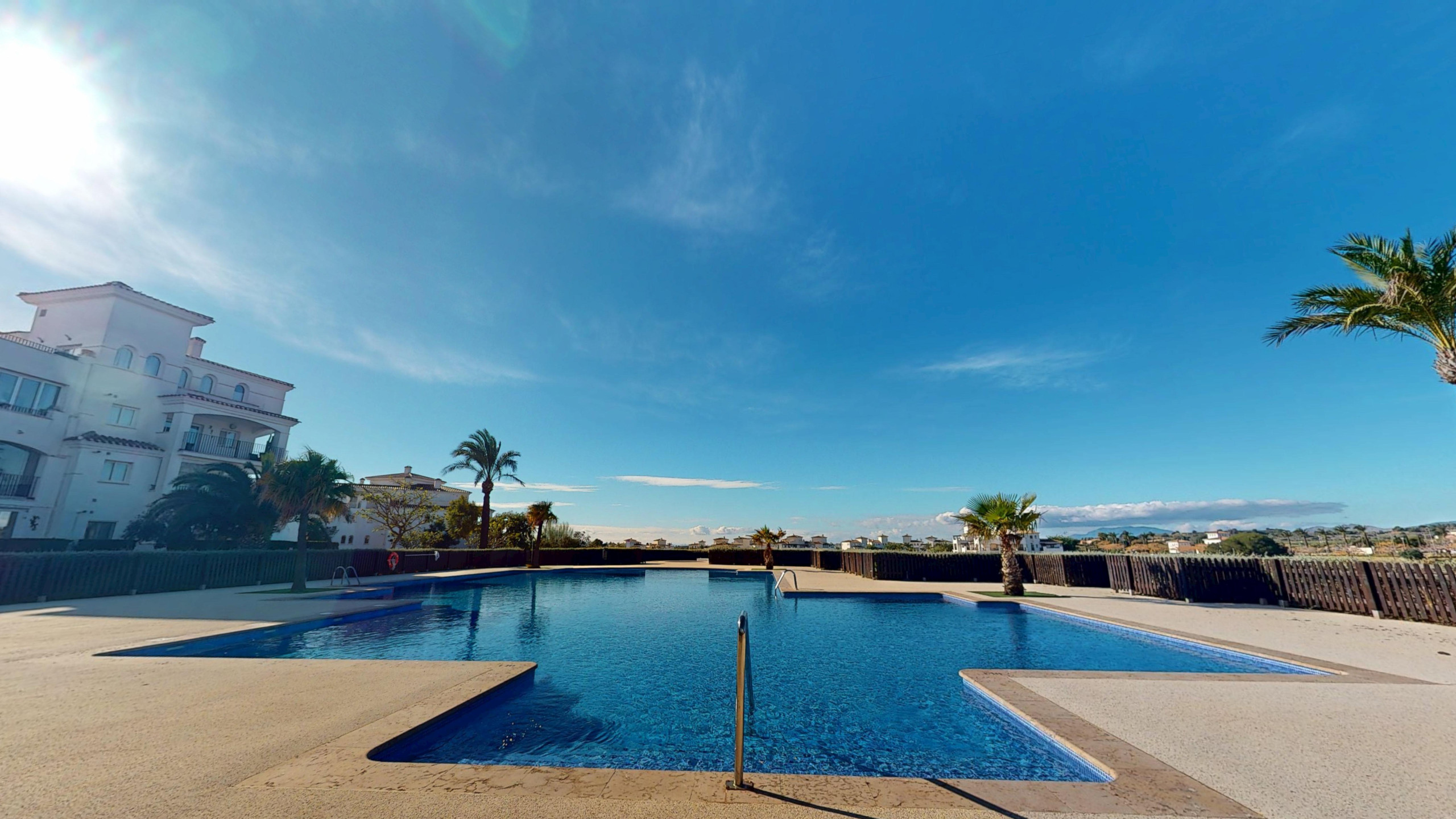 El complejo cuenta con zonas infantiles, pista de tenis, pista de pádel, piscinas comunitarias y amplio aparcamiento al aire libre.