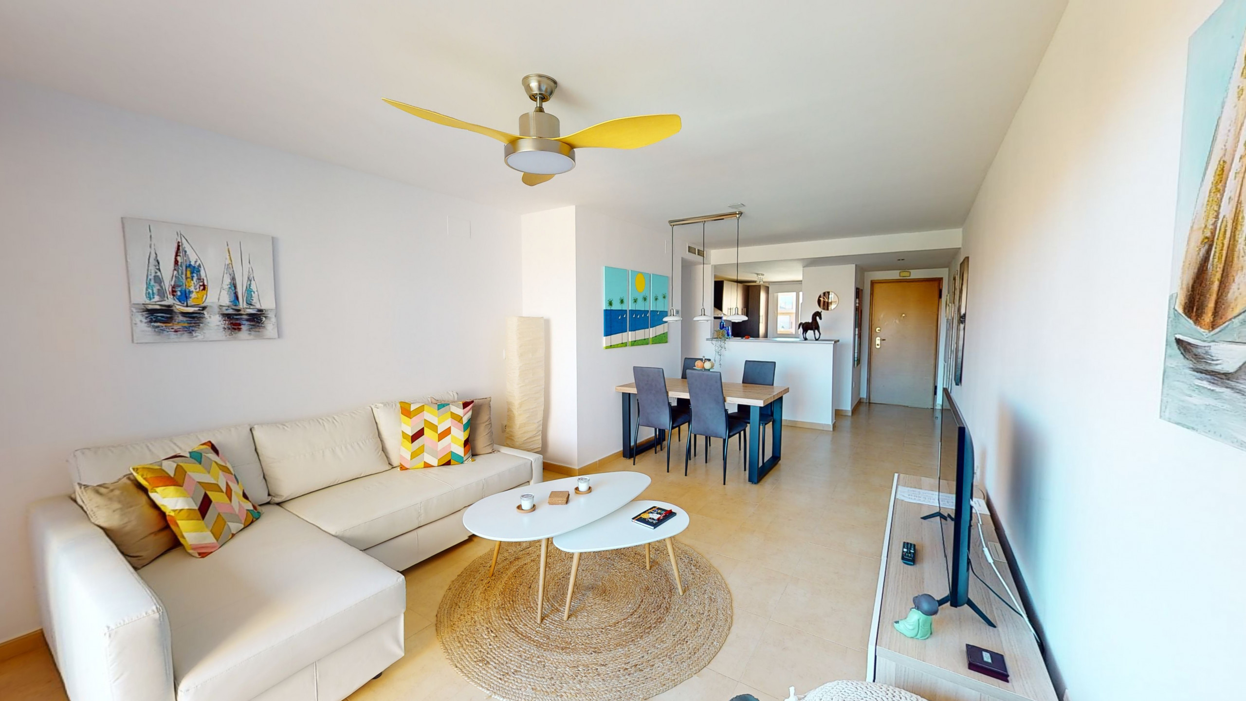 El salón de planta abierta es moderno y está amueblado con estilo. Hay un sofá esquinero (para dormir) y un asiento envolvente a juego, de modo que hay espacio cómodo para cuatro personas. Junto con una mesa y sillas de comedor contemporáneas, si elige cenar en el interior, este apartamento es perfecto para usarlo durante todo el año. Hay wifi gratuito y una televisión inteligente con canales británicos y otros europeos en el apartamento. Grandes puertas correderas hacen que el apartamento sea luminoso y aireado y se abren a la amplia terraza con vistas a la piscina, los jardines y el campo de golf.