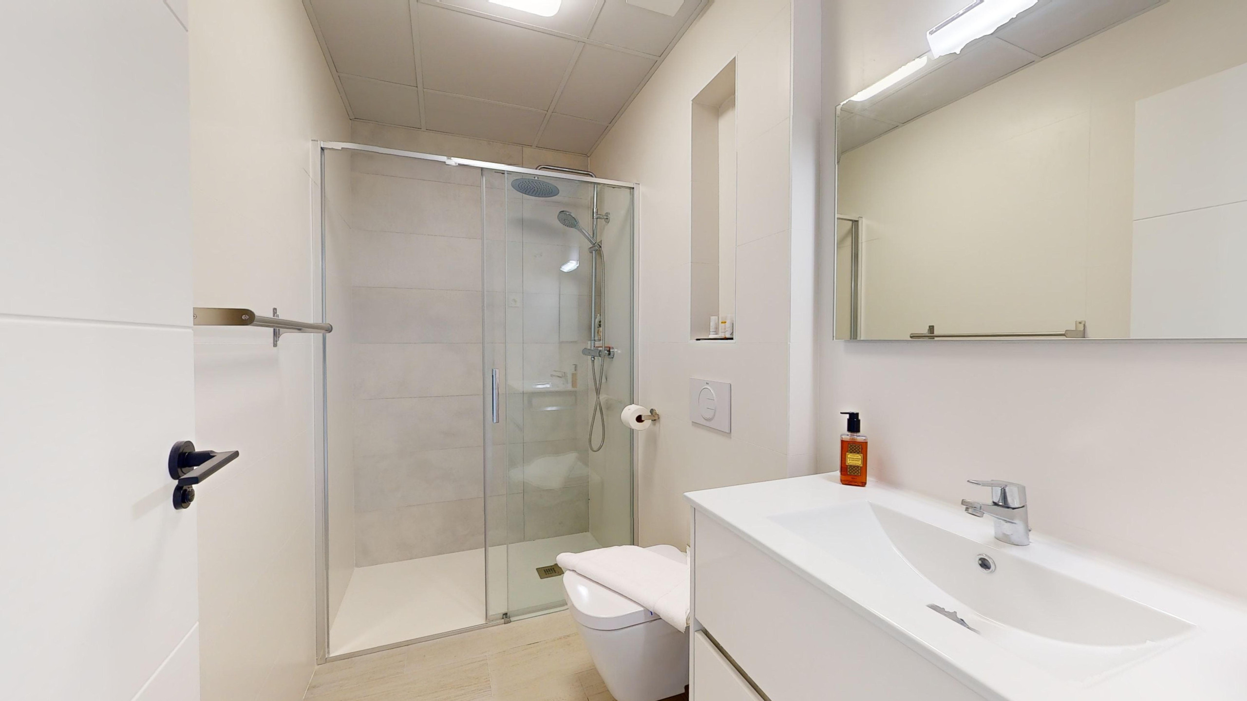 El segundo dormitorio es una habitación doble, también con armarios empotrados. El gran cuarto de baño familiar está justo al lado y cuenta con ducha sobre la bañera, mampara de ducha, inodoro, bidé, mueble de almacenaje y toallero eléctrico.