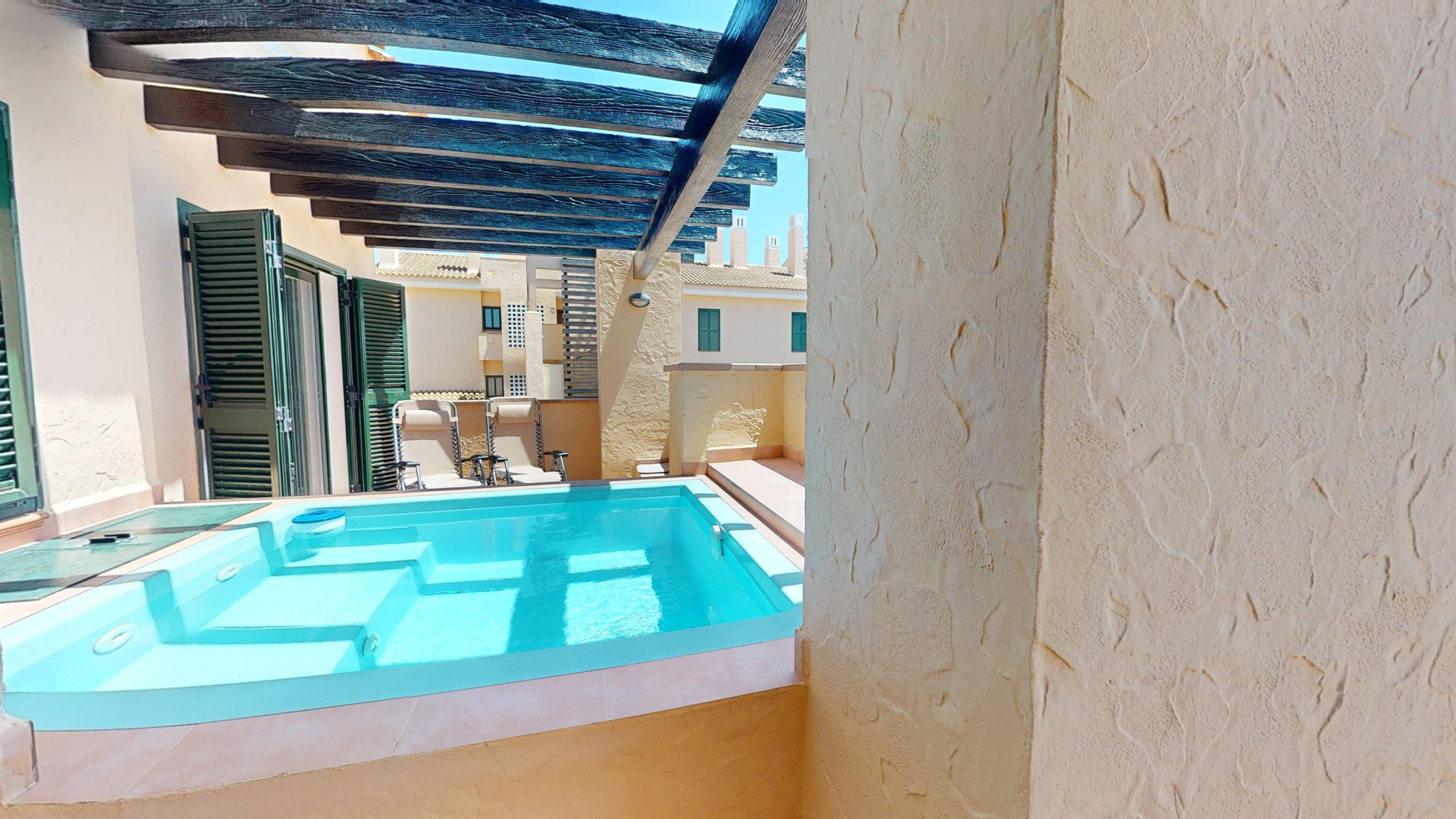 The oversized terraces with areas for sunshine and shade, large splash pool all with open views.