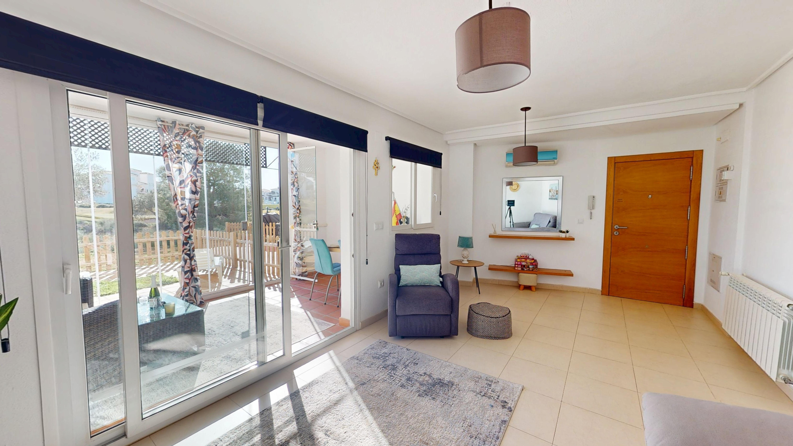 Modern two bed garden apartment with glass curtains and fully tiled terrace. Overlooks the third hole on golf course and easy walk to quiet pool as it is only one block away. South facing.