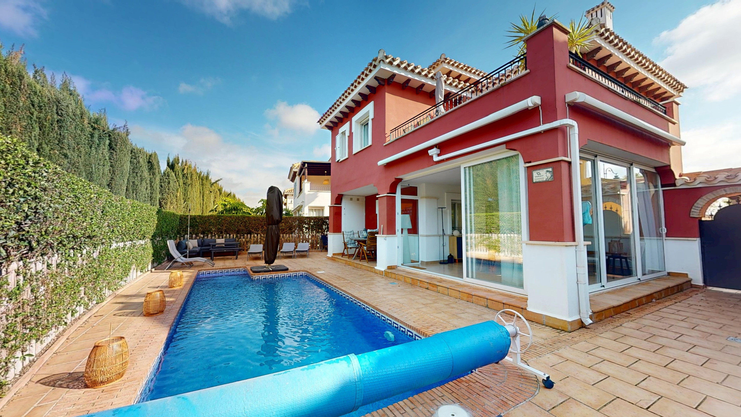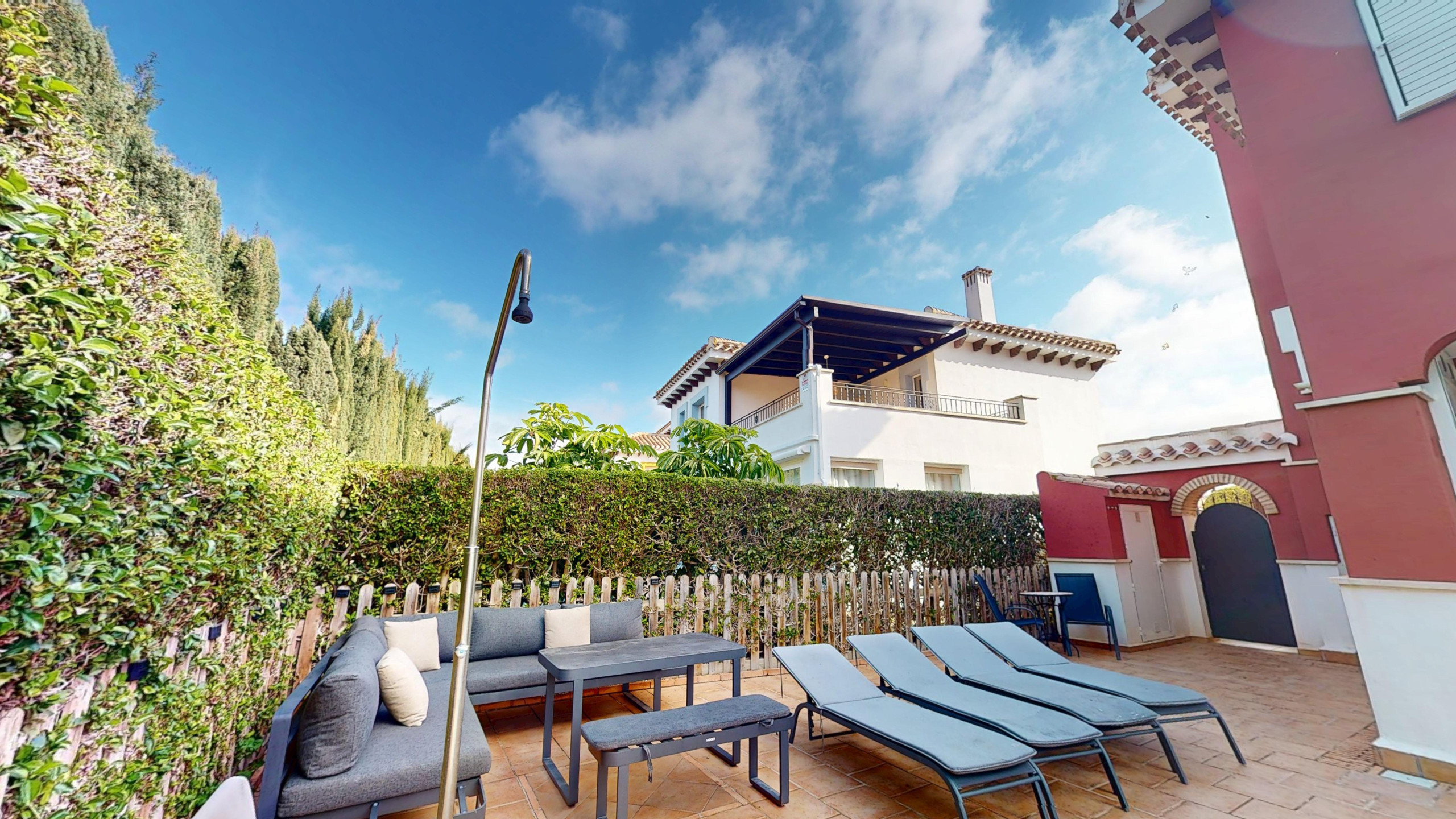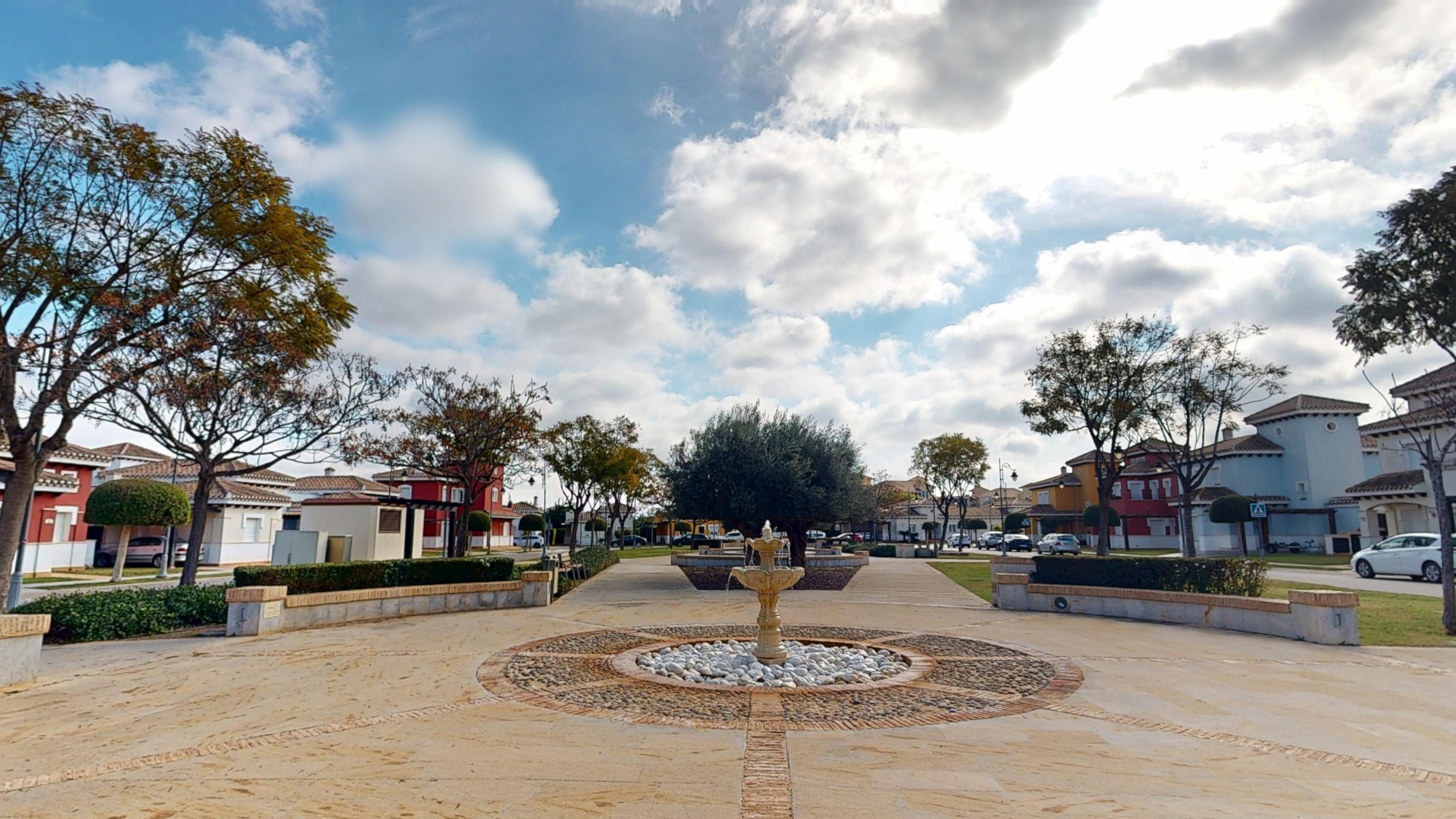 A delightful 3 bedroom Baron Villa overlooking a pretty fountain and plaza on the resort. Within 5 minutes walking distance to the resort hotel and amenities, golf course and driving range, the villa is in the perfect spot. Not overlooked at the rear, the property which has air con throughout has been decorated and furnished to a high standard in 2025. Large outside area with new corner unit, sun loungers and parasol. Heated Pool. Outside BBQ. Fully Equipped Kitchen with dishwasher, coffee machine, washing machine, fridge freezer and microwave. Sunroom with dining table which sits six. Upstairs terrace with golf views and sun loungers. Downstairs WC. One bedroom ensuite and another separate shower room upstairs. All bedrooms have high quality bed and bath linen.