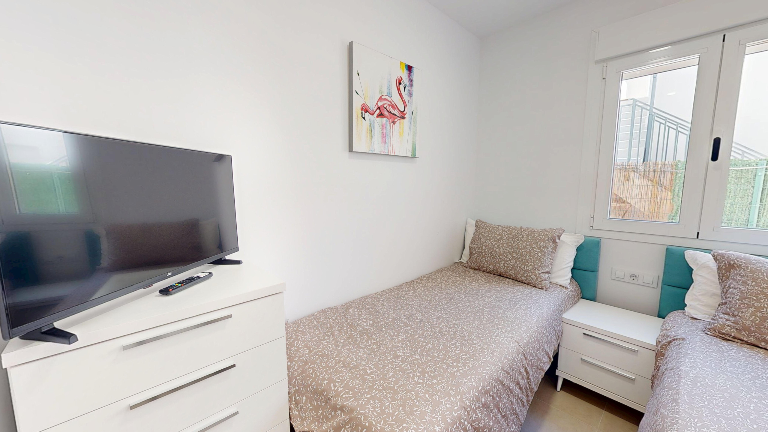 2 bed villa with roof terrace, private 3x4m pool, 75m indoor living space and 175m outdoor living space. In one bedroom there is two single beds and in the master room there is one king size. Front room/dining room/ kitchen has sofa bed for two. Master room has ensuite. Guest bathroom in the middle of both rooms. Property is fully furnished and all brand new. It has a roof terrace and a carport. Roof terrace is also furnished with seating and four post sun lounger. Full size table tennis is at the property. Both bedrooms have built in wardrobes and tuned in Smart TV’s.