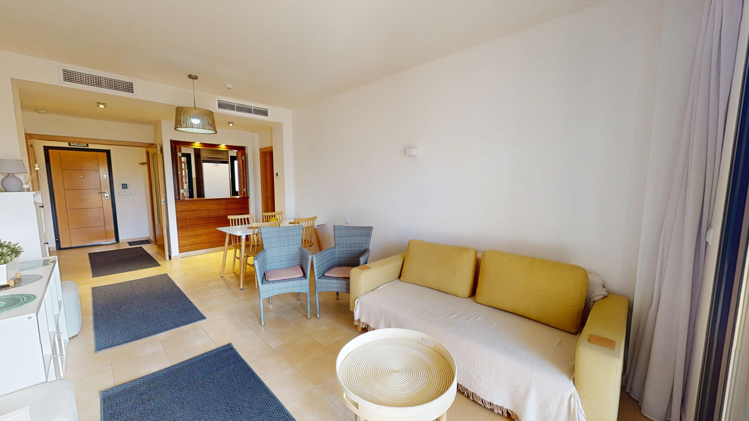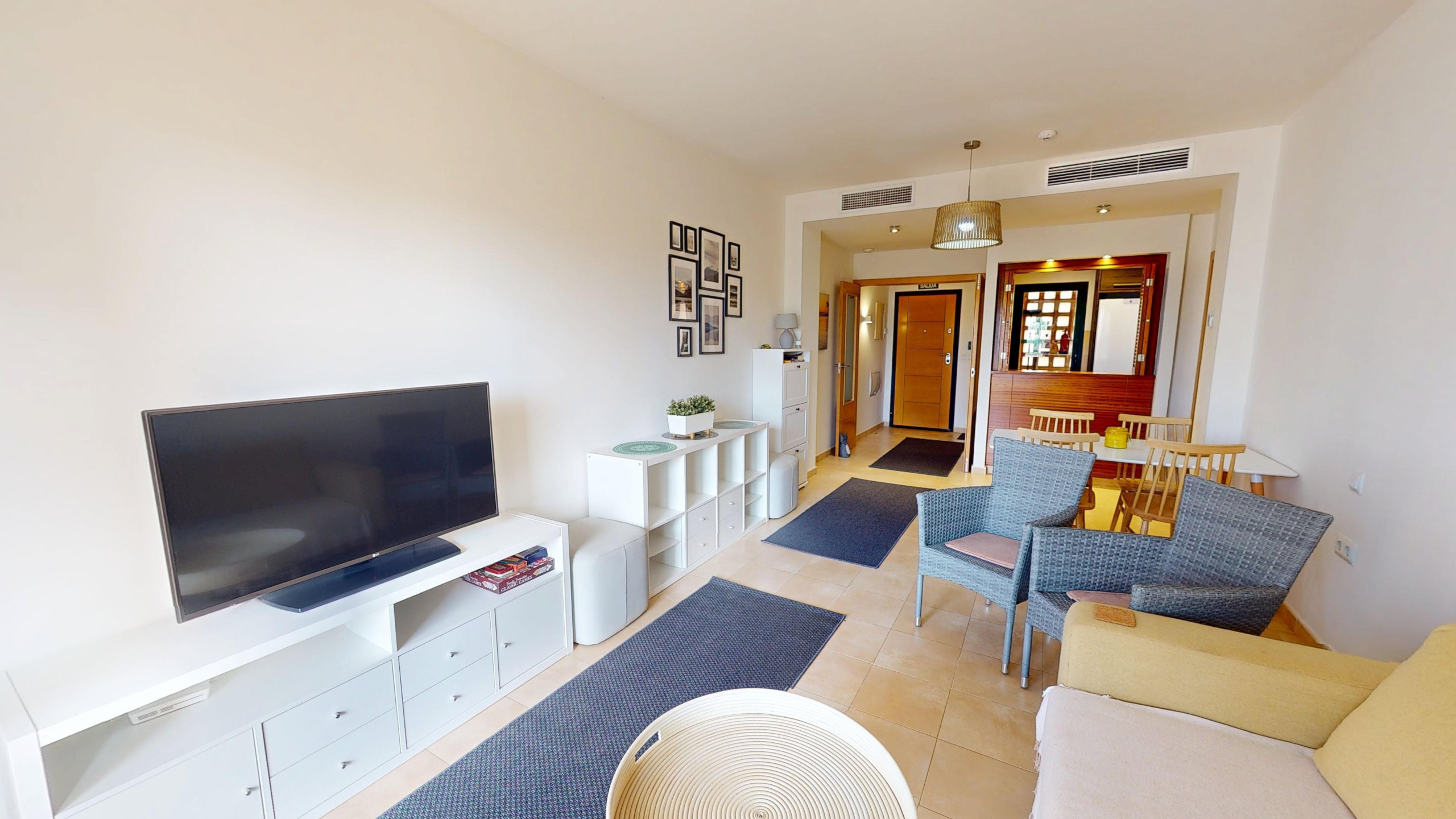 From the numbered parking space with this apartment, level access to one flight of stairs up, exterior entrance to just two apartments. Quality security door opens to an entrance hallway, top quality ceramic tiles flow through the entirety of the apartment, giving a bright and airy feeling to the whole of the living space.