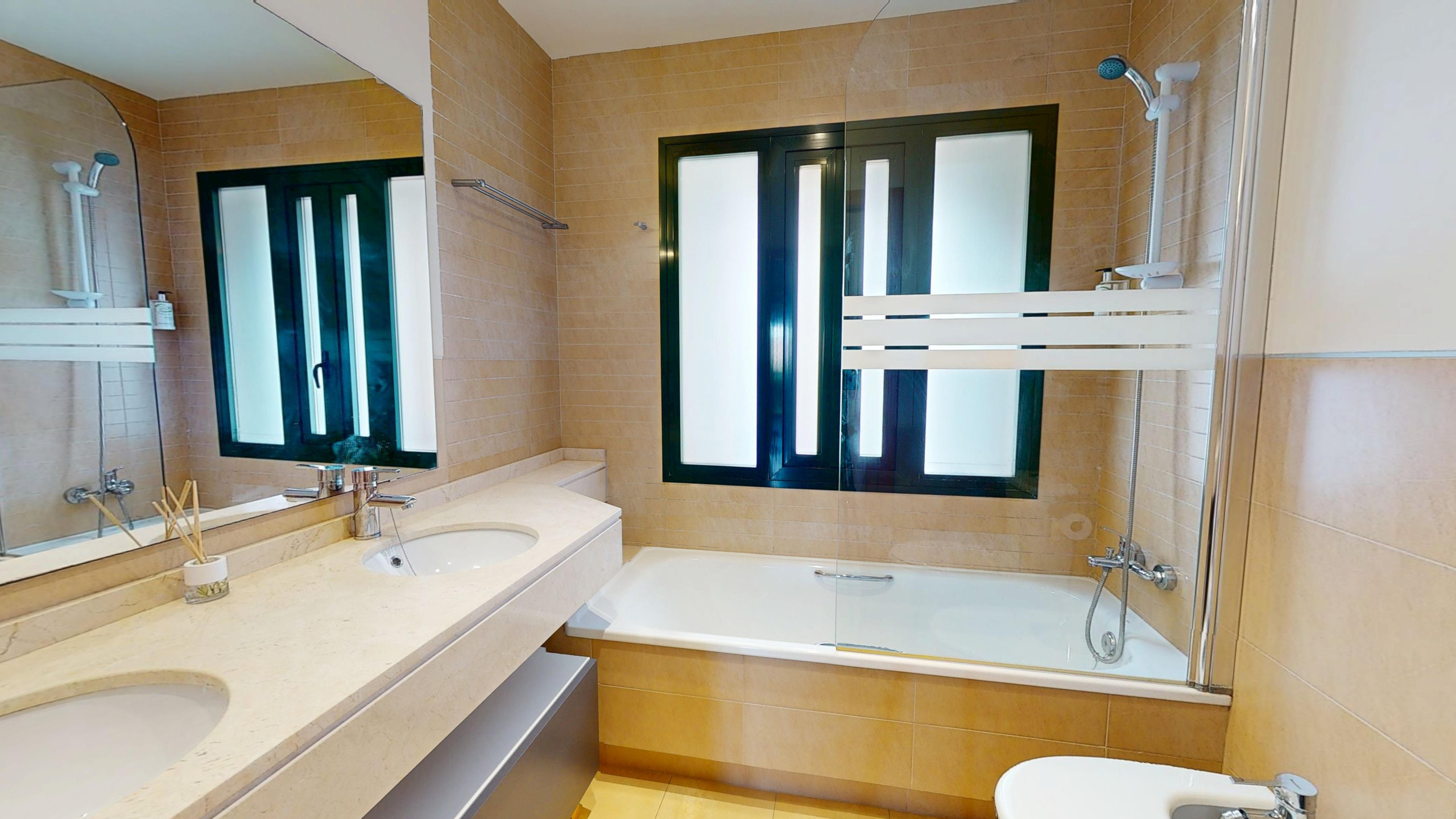Impressive master bedroom suite with private bathroom and direct access to the terrace via full length sliding patio windows; two sets of sliding doors open to lined and fitted wardrobes, whilst the bathroom boasts a marble topped vanity unit with twin inset sinks, bath with shower over, fitted shower screen and WC.