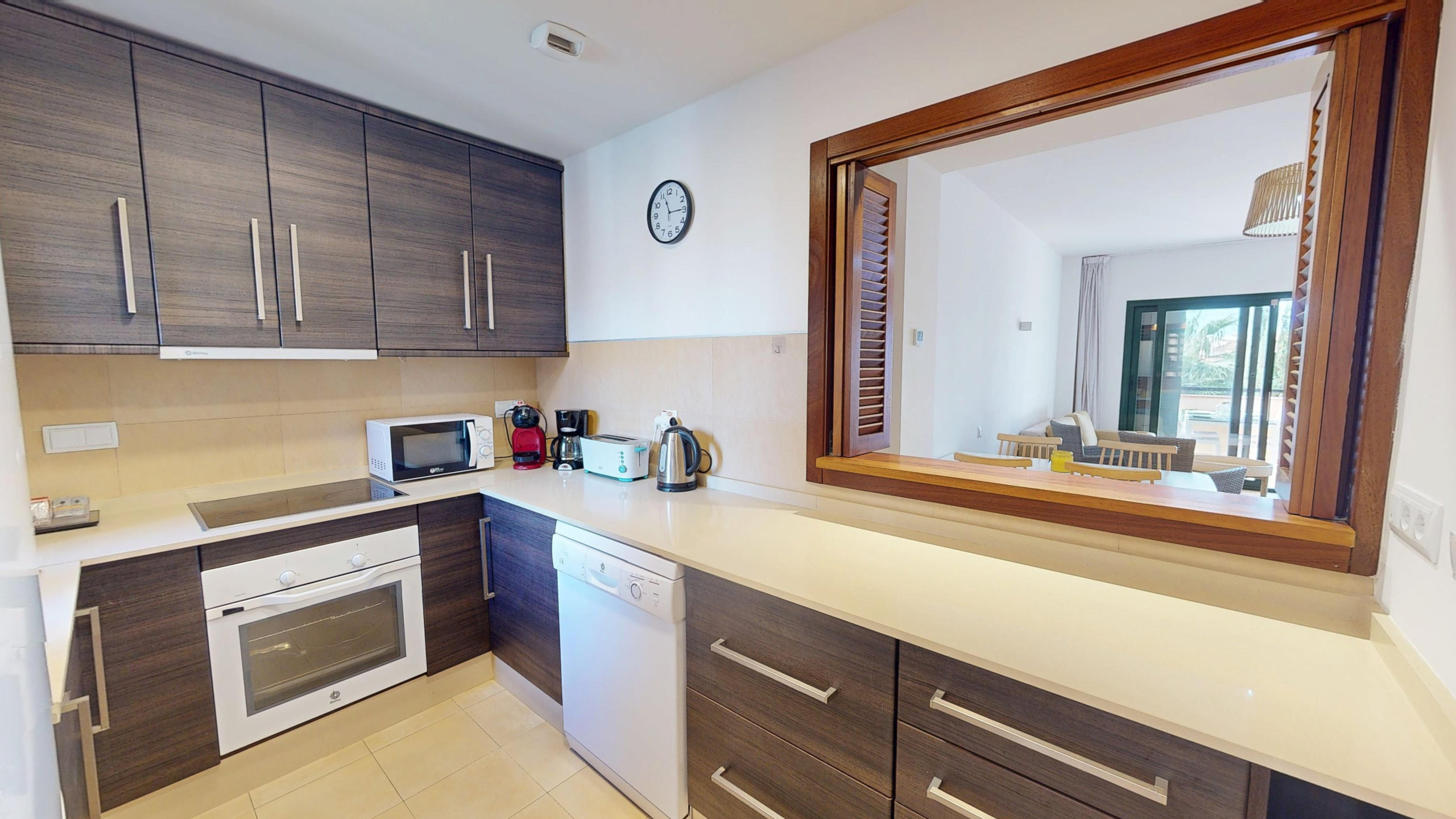 From the entrance hallway, feature double doors open to the combined living and dining area, your eye will wander immediately to the sliding patio windows that open to the South West facing views of the Spanish village and the hills / mountain's