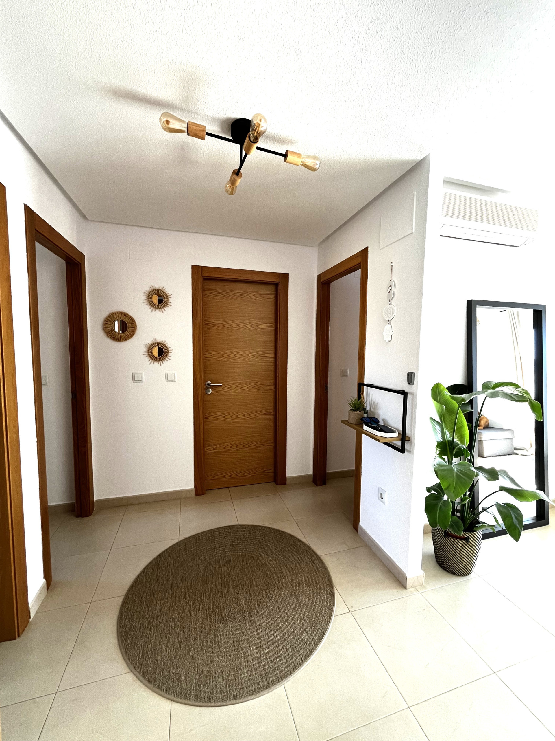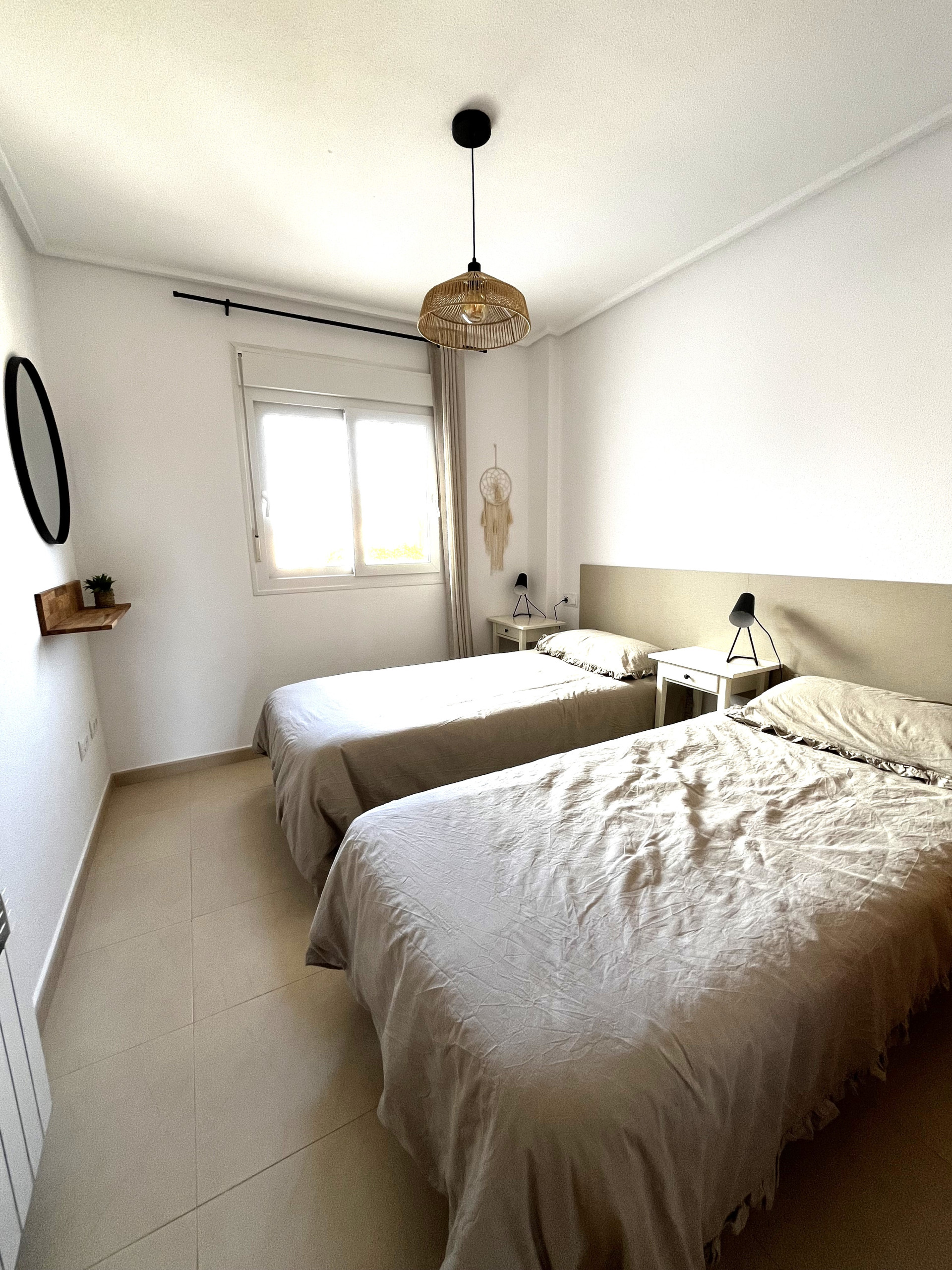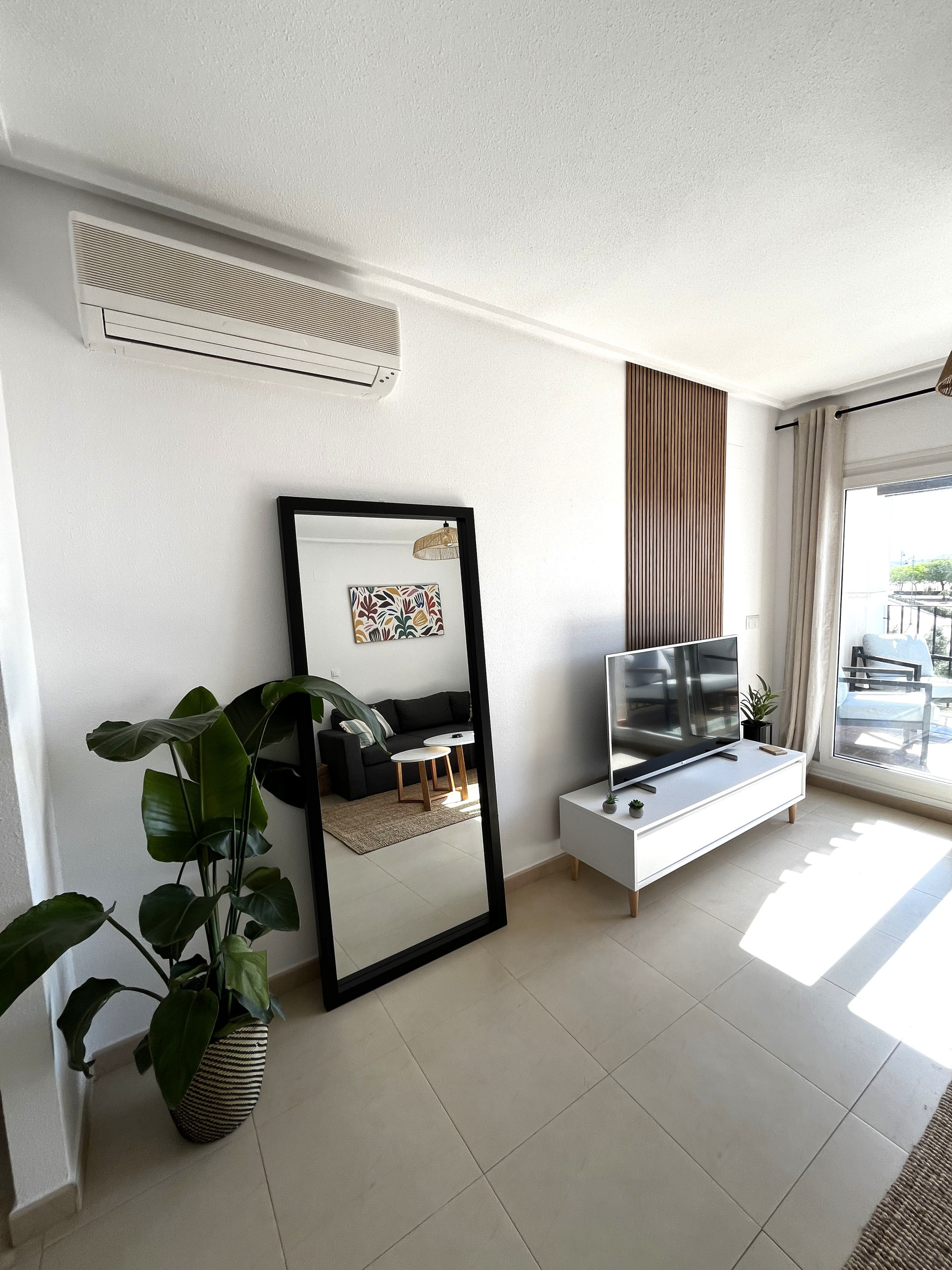 This Penthouse is beautifully decorated and overlooks the third hole of the Jack Nicolaus Golf course at Hacienda Riquelme. It has two bedrooms that open onto small front terraces, and there is a spacious open terrace that overlooks the golf course. It is a short walk to the on site driving range, golf shop, supermarket, restaurant and bar. Guests have access to all shared swimming pools on the resort, along with play areas and tennis courts with 24 hour security on the site