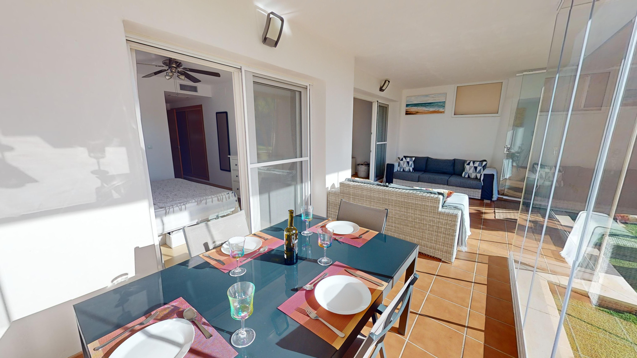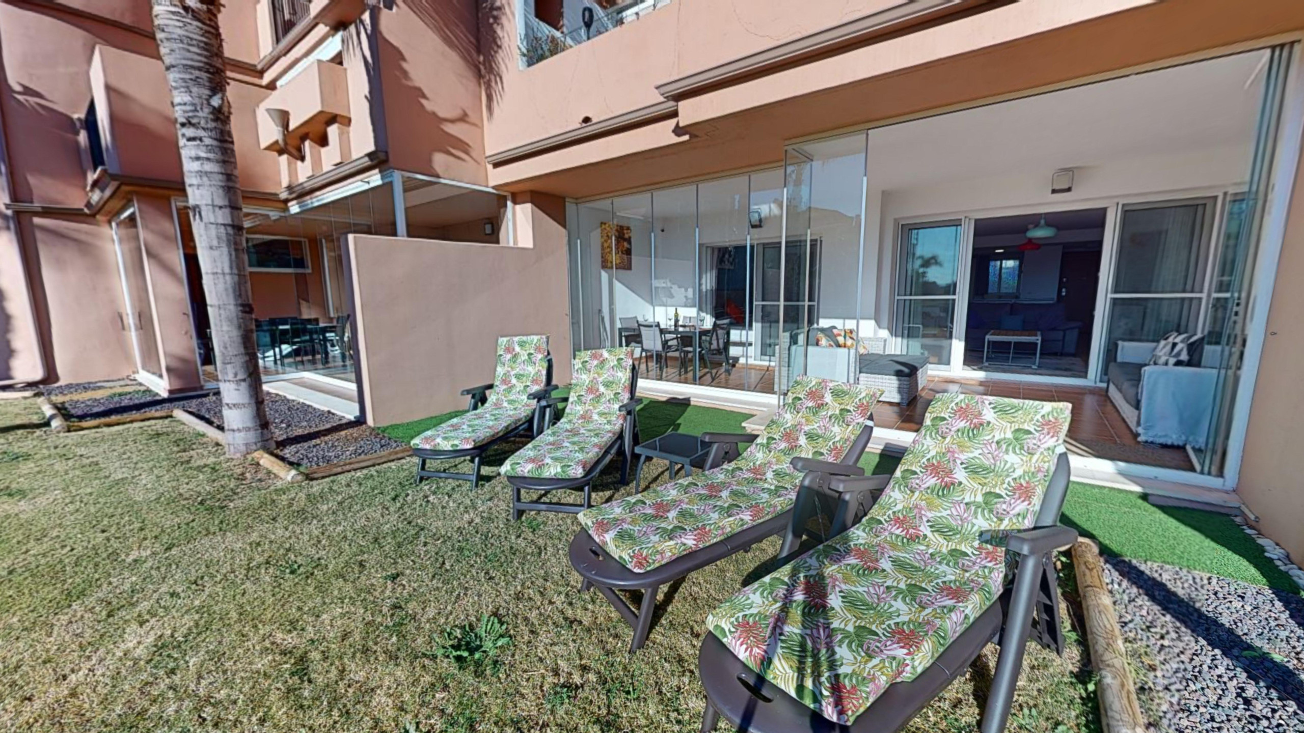 New to market this gorgeous ground floor apartment on Mar Menor Golf Resort. This stunning south facing apartment is opposite one of the resort’s communal pools in a beautiful location. It is immaculately presented with both bathrooms refurbished and a modernised kitchen. It is beautifully furnished with full hot and cold vented aircon throughout. There are glass curtains to the large terrace creating an additional room where you can enjoy the beautiful views all year round as well as easy access to the pool or sun bathing areas.