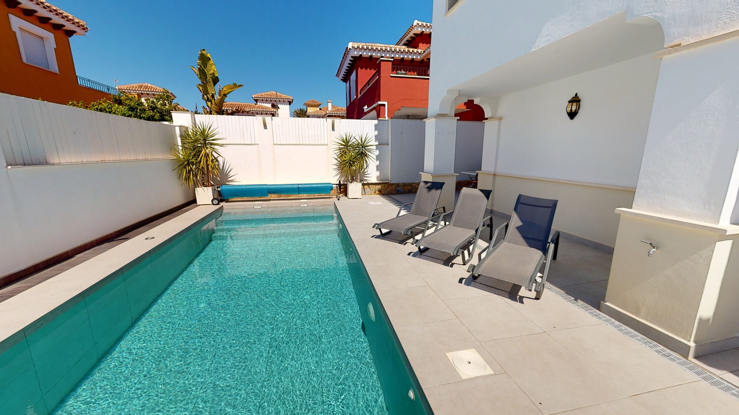 Beautifully decorated 3 bed villa with private swimming pool. Newly fully fitted kitchen , dining table for 6+ people, 50 inch colour TV with mag box (sky) . Outside you will find 6 sun loungers and outside table and chairs for 6 people down stairs with table and chairs on upstairs solarium .Full central heating and air conditioning throughout , this property has just been fully decorated and furnished to a very high standard. Private pool and newly tiled terrace.